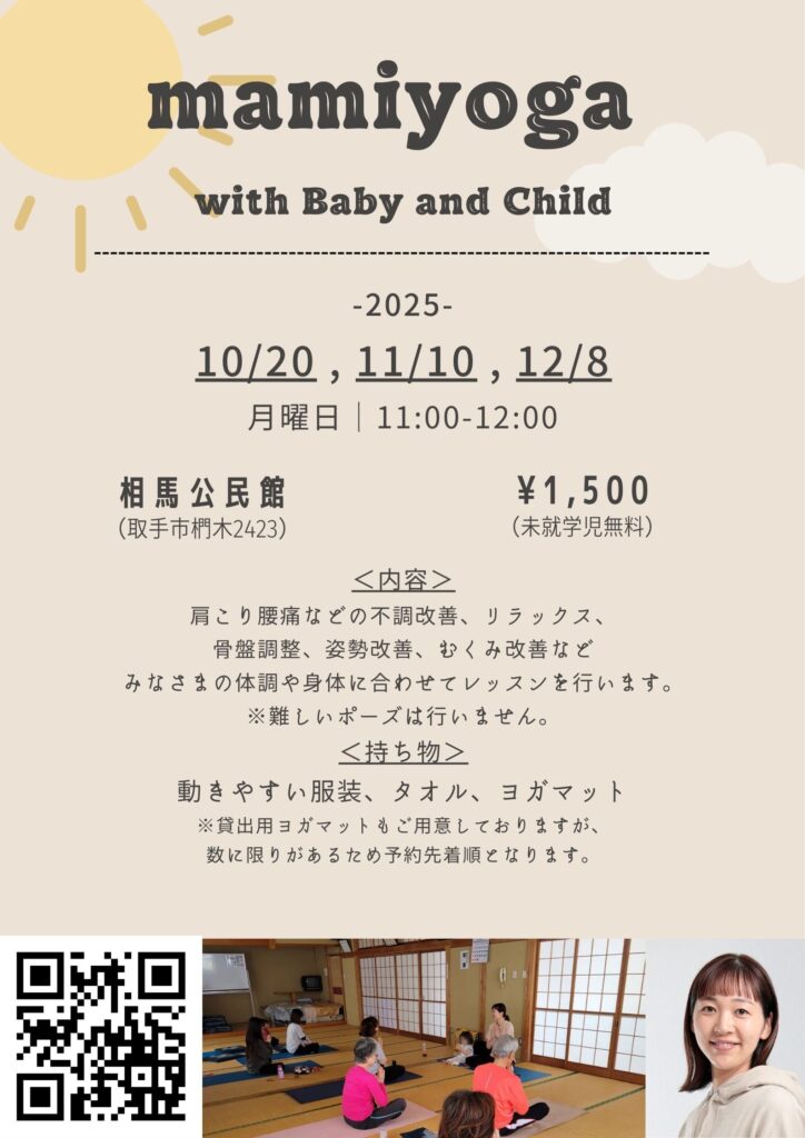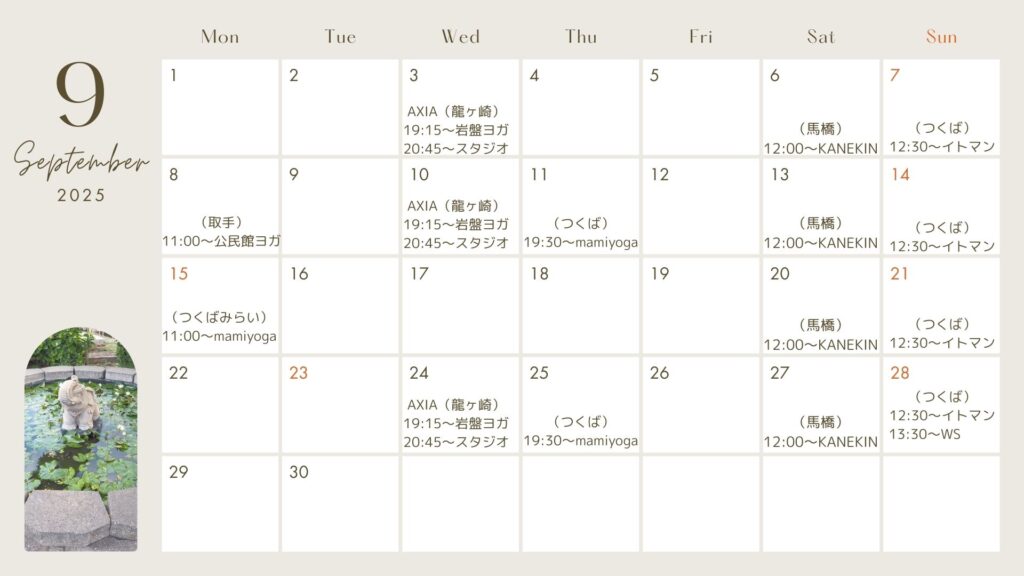 mamiyogaは、11(木)と25(木)が夜75分クラス、15(祝)がお昼の60分クラス。
